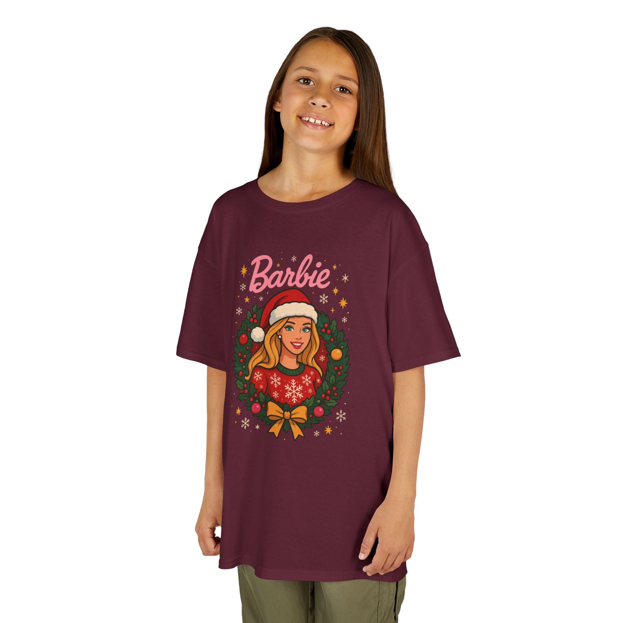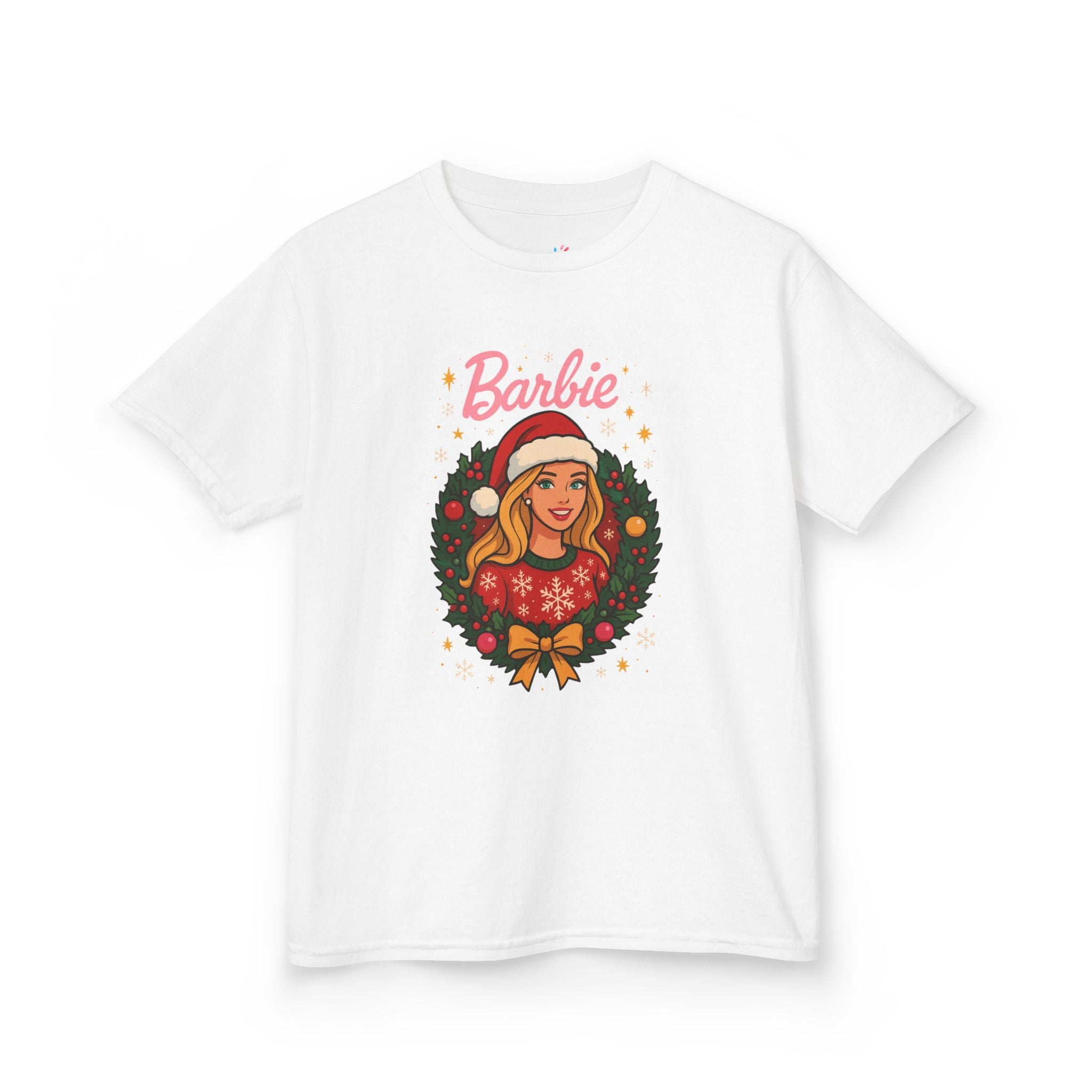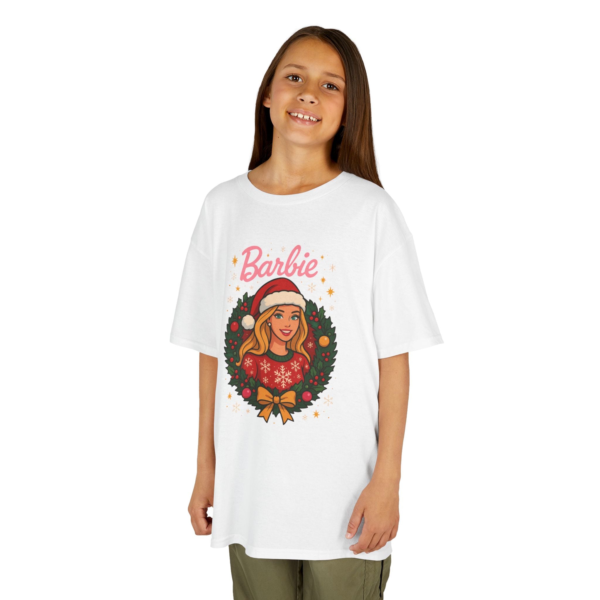 A soft, midweight kids tee printed with a cozy holiday portrait. The front shows a warm, festive illustration of a girl in a Santa hat framed by a wreath and subtle confetti—bright yet gentle on everyday wear. The crew neck and classic cut let children move freely while the tubular knit and shoulder tape keep the shirt looking neat through play and washes. Breathable US cotton gives it a comfortable, familiar feel for layering under jackets or wearing on its own during seasonal celebrations.