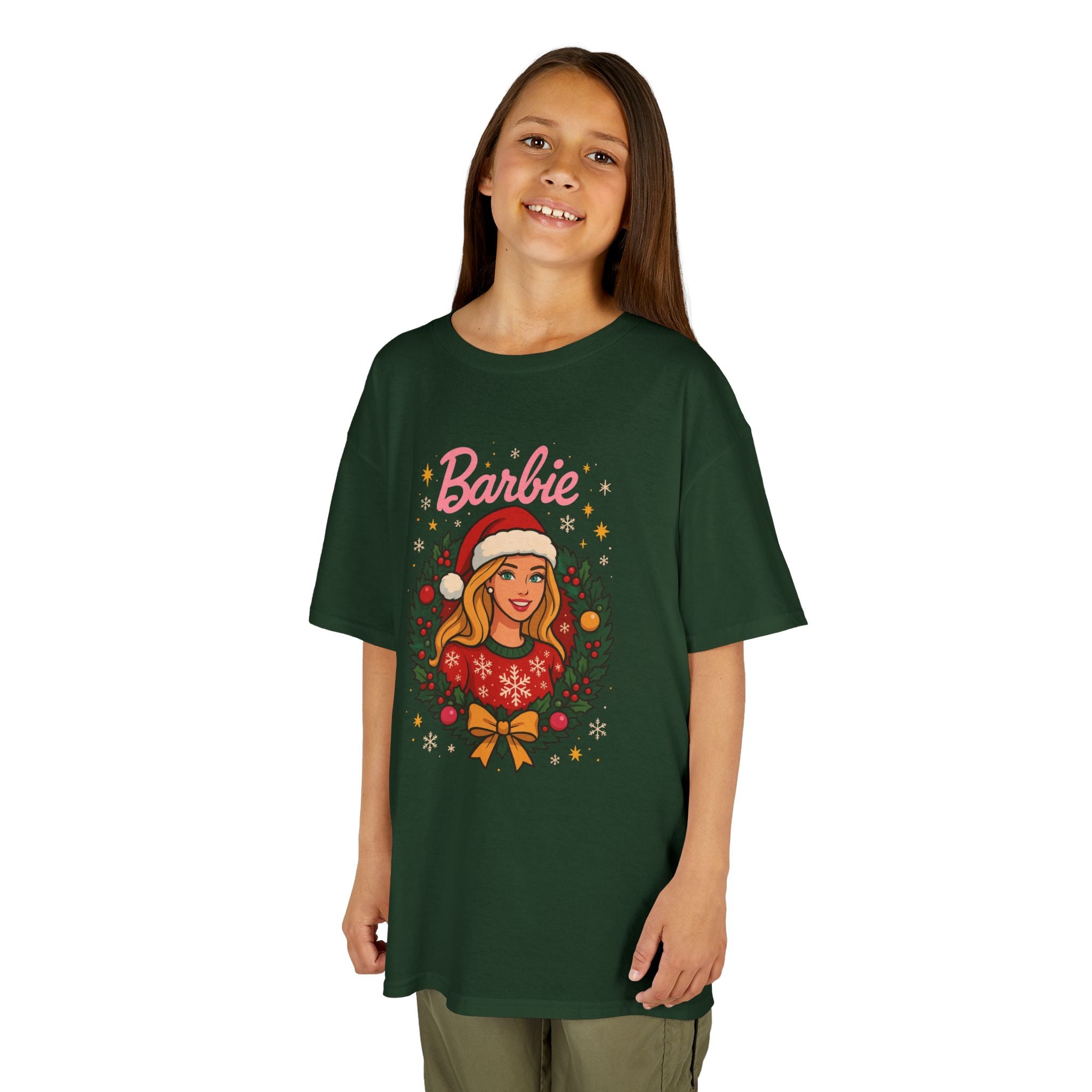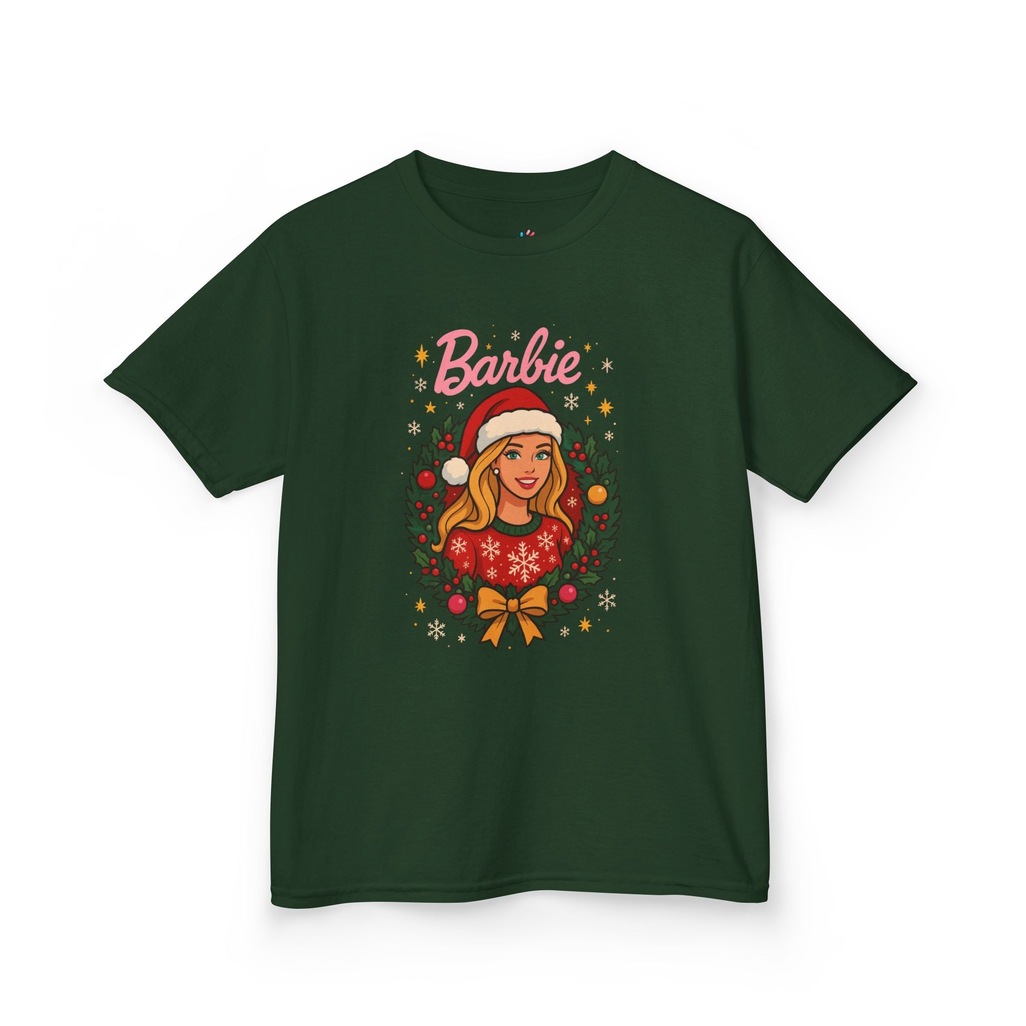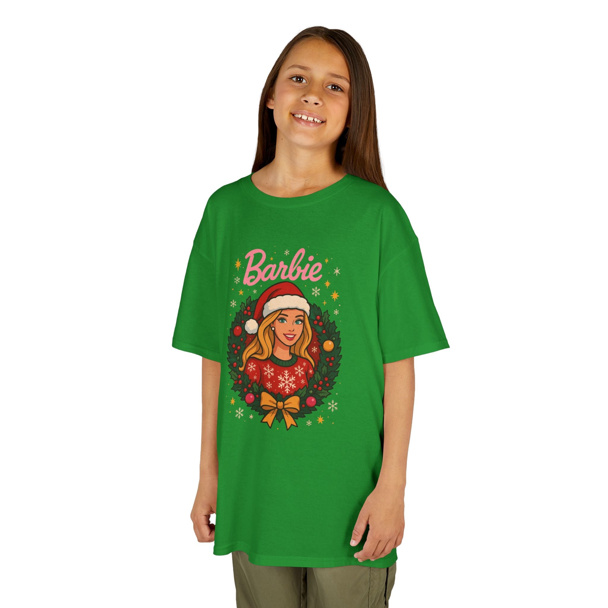 A soft, midweight kids tee printed with a cozy holiday portrait. The front shows a warm, festive illustration of a girl in a Santa hat framed by a wreath and subtle confetti—bright yet gentle on everyday wear. The crew neck and classic cut let children move freely while the tubular knit and shoulder tape keep the shirt looking neat through play and washes. Breathable US cotton gives it a comfortable, familiar feel for layering under jackets or wearing on its own during seasonal celebrations.